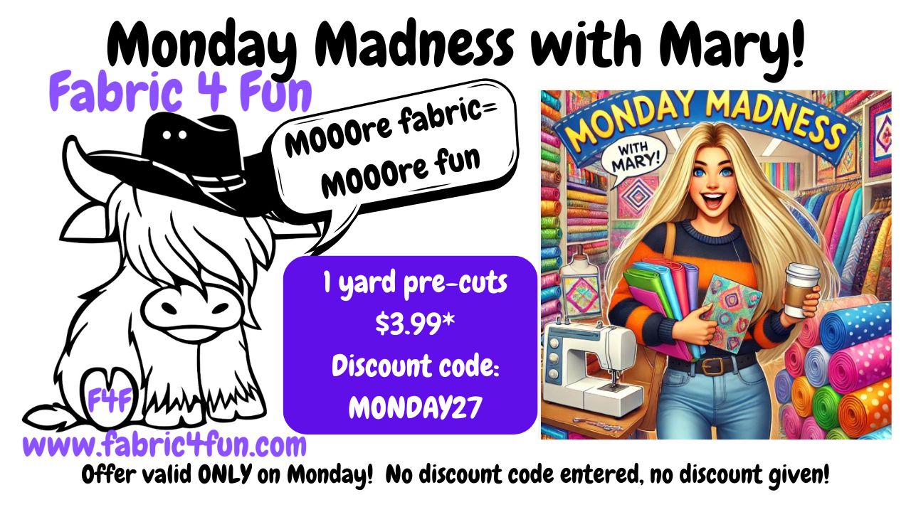 Check out over 50 prints to choose from for only $5/yard! OR ...... remember MOOre fabric = MOOre fun as Stash likes to say and get the whole 8 yard bolt for only $35 or a 10 yard bolt for only $45!