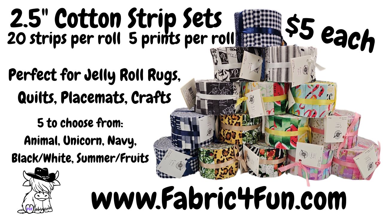Shop Strip Sets HEREBy Loops & Threads. 100% cotton (20) 2-1/2" strips. 4 cuts of 5 different prints per roll. 5 collections to choose from: Black/White Farm Prints, Unicorn Prints, Navy/White Prints, Sumer/Fruit Prints, Animal Print-